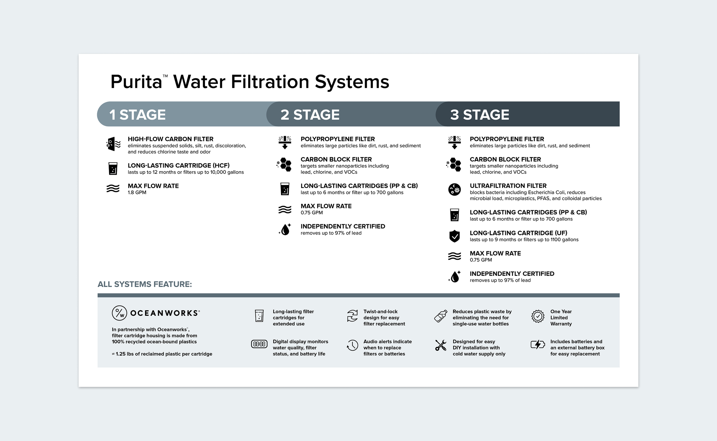 To help visitors navigate Kraus's Water Filtration System offerings, I partnered with the Product Development team to create an infographic that visually communicates key differentiators and shared features across the collection — making complex product distinctions easy to digest at a glance.