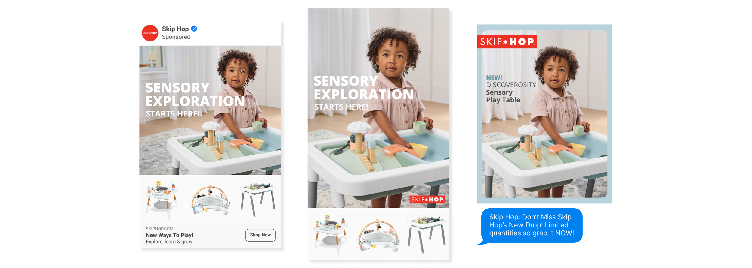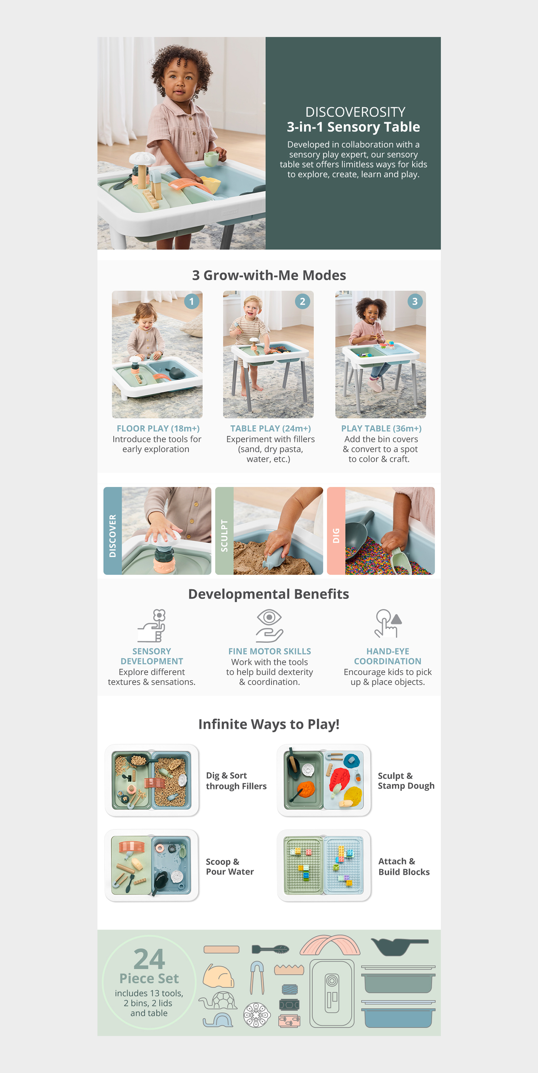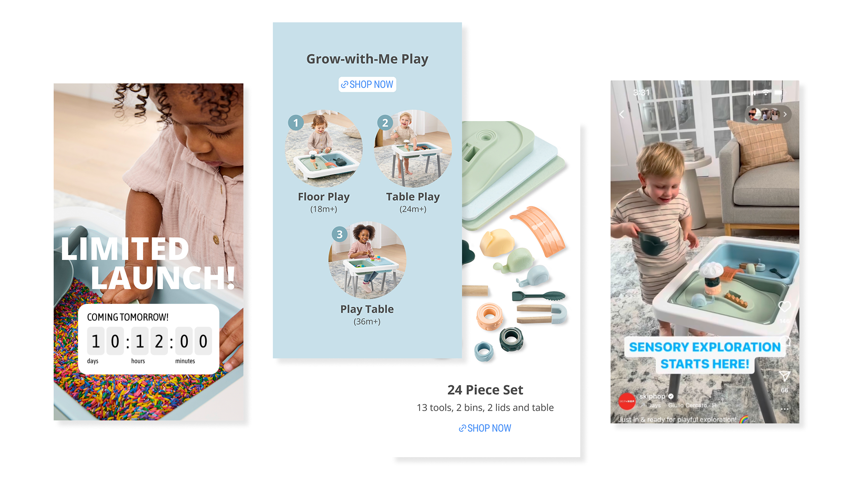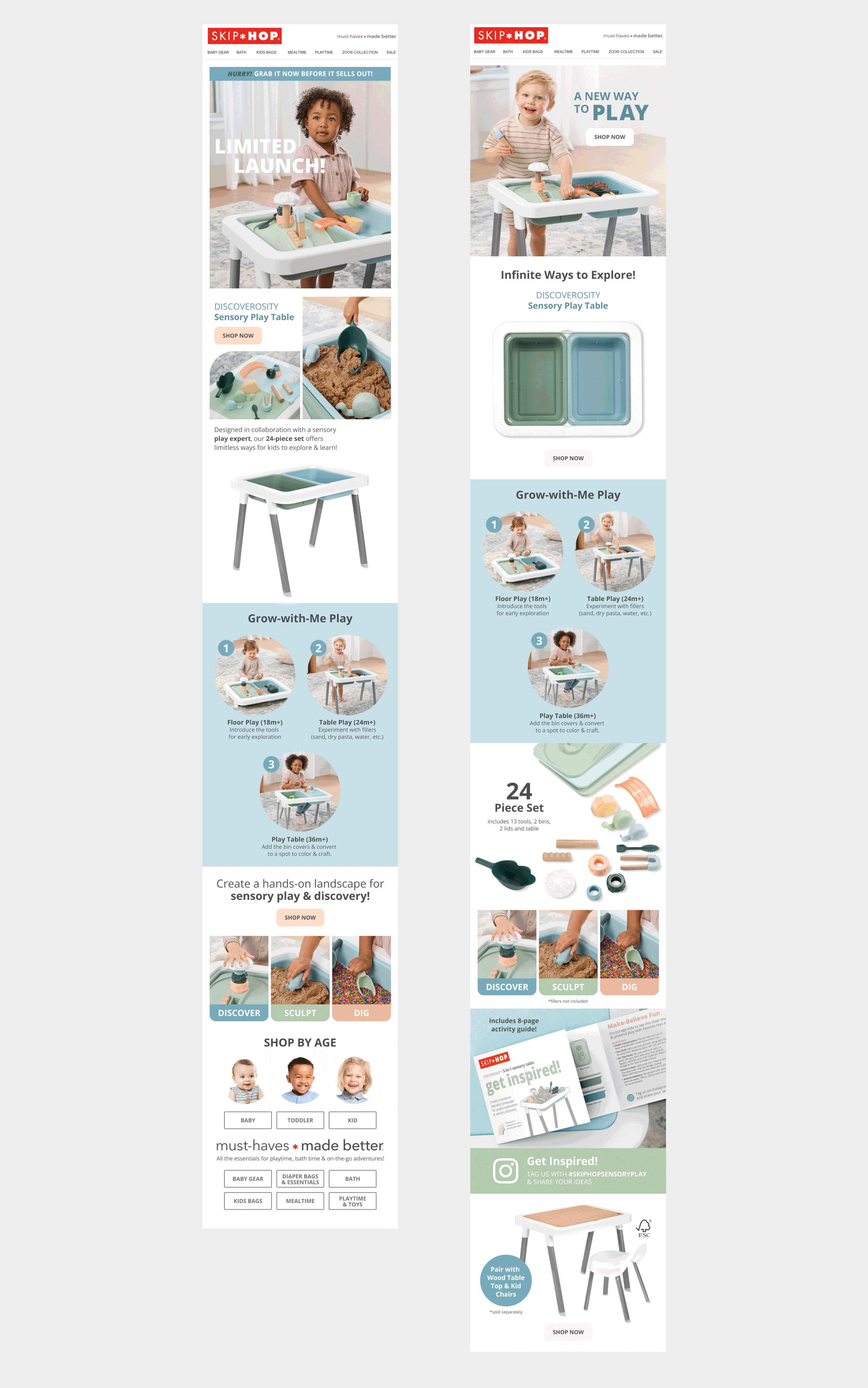 Partnered with creative leadership to conceptualize and art direct a photoshoot for the launch of the new Discoverosity Sensory Play Table, a trend-forward product for toddlers and young kids. The imagery was clean and fresh, allowing the product’s pops of color to stand out to millennial parents seeking decor-friendly items. I then led the design of a cohesive integrated marketing campaign, developing assets across web, email, paid and organic social, and SMS to generate awareness and drive sales.